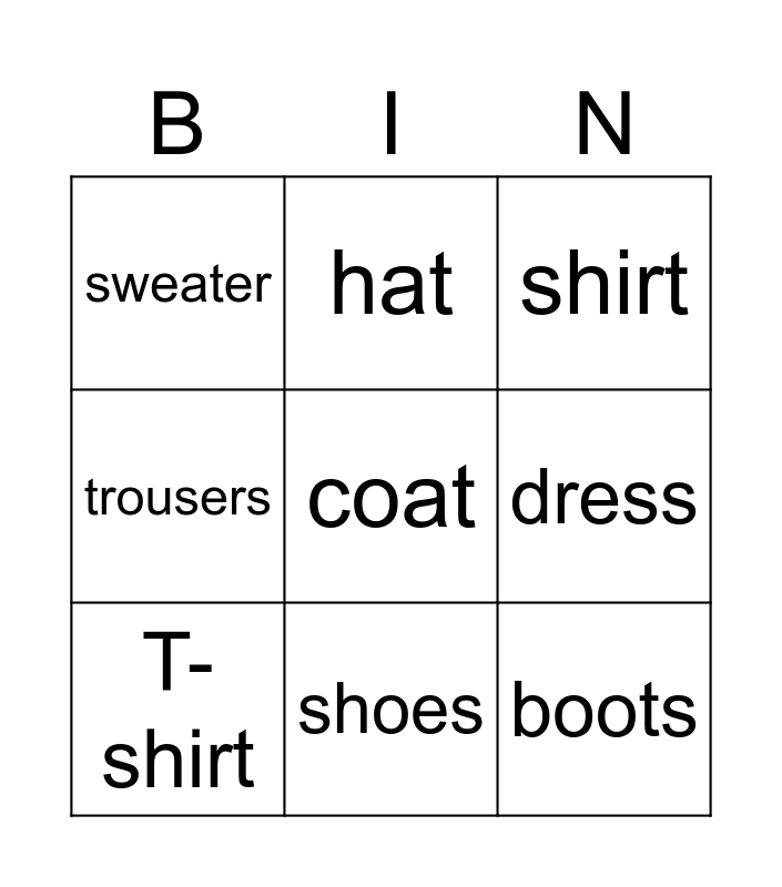 This bingo card has 12 words: Free!, boots, coat, dress, hat, shirt, shoes, skirt, sweater, trousers, T-shirt and clothes.