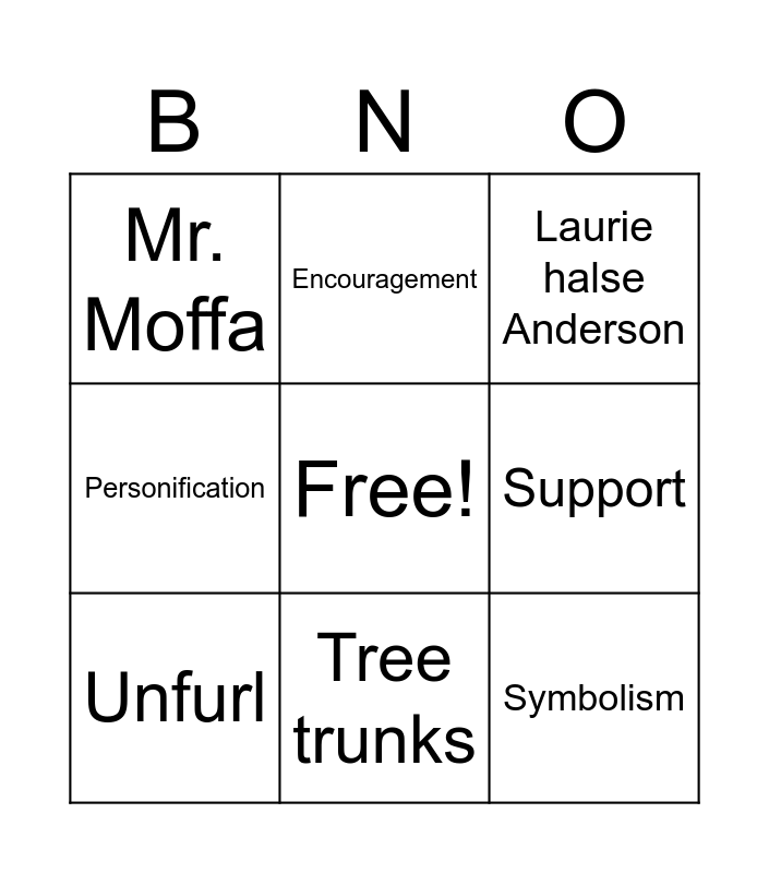 This bingo card has a free space and 21 words: Dance, Stanza, Encouragement, Heal, Talk out, Unfurl, Mr. Moffa, Laurie halse Anderson, Angel wings, Tree trunks, Shout, Personification, Metaphor, Speak out, Support, Page to page, Reader, me to you, Symbolism, Backbone and Steadfast heart.