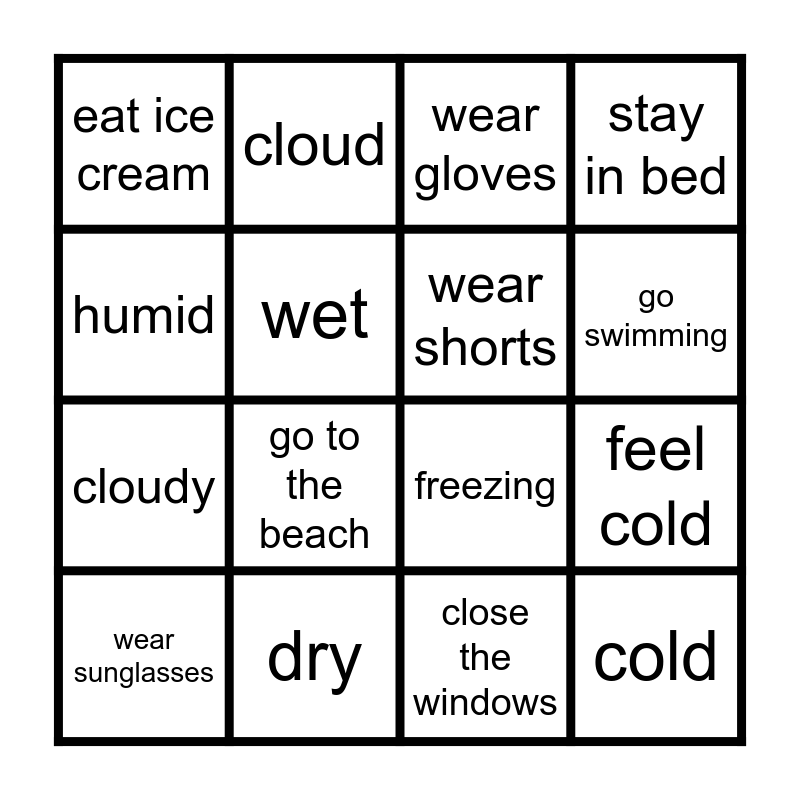 This bingo card has 17 words: close the windows, wear sunglasses, wear gloves, eat ice cream, go to the beach, stay in bed, feel cold, wear shorts, go swimming, wet, dry, freezing, humid, cloud, cloudy, hot and cold.