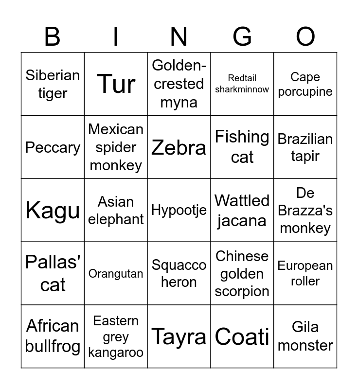 This bingo card has a free space and 24 words: Orangutan, Eastern grey kangaroo, Zebra, African bullfrog, Cape porcupine, Siberian tiger, Peccary, Tur, Wattled jacana, Squacco heron, Fishing cat, Kagu, Chinese golden scorpion, European roller, Mexican spider monkey, Coati, De Brazza's monkey, Golden-crested myna, Brazilian tapir, Asian elephant, Gila monster, Pallas' cat, Redtail sharkminnow and Tayra.