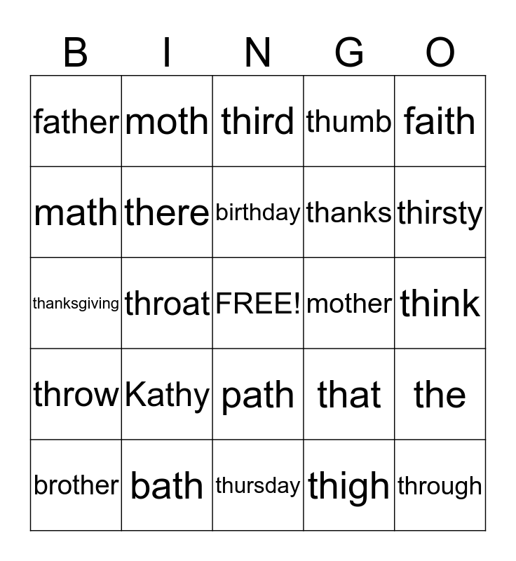 This bingo card has a free space and 24 words: Kathy, bath, birthday, brother, faith, father, math, moth, mother, path, thanks, thanksgiving, that, the, there, thigh, think, third, thirsty, throat, through, throw, thumb and thursday.