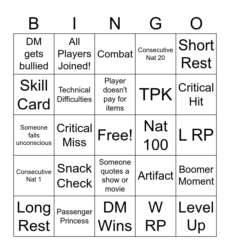 This bingo card has a free space and 24 words: Snack Check, Passenger Princess, Player doesn't pay for items, Long Rest, Short Rest, DM gets bullied, Skill Card, All Players Joined!, Nat 100, Someone quotes a show or movie, TPK, Someone falls unconscious, Artifact, Boomer Moment, Technical Difficulties, W RP, L RP, Combat, Critical Hit, Critical Miss, Level Up, Consecutive Nat 1, Consecutive Nat 20 and DM Wins.
