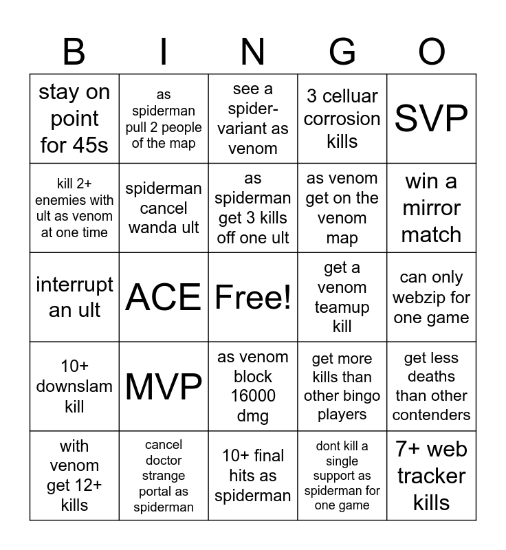 This bingo card has a free space and 24 words: MVP, cancel doctor strange portal as spiderman, as spiderman get 3 kills off one ult, with venom get 12+ kills, SVP, stay on point for 45s, kill 2+ enemies with ult as venom at one time, as spiderman pull 2 people of the map, get a venom teamup kill, as venom block 16000 dmg, as venom get on the venom map, interrupt an ult, get more kills than other bingo players, get less deaths than other contenders, spiderman cancel wanda ult, dont kill a single support as spiderman for one game, can only webzip for one game, see a spider-variant as venom, win a mirror match, ACE, 7+ web tracker kills, 10+ downslam kill, 3 celluar corrosion kills and 10+ final hits as spiderman.