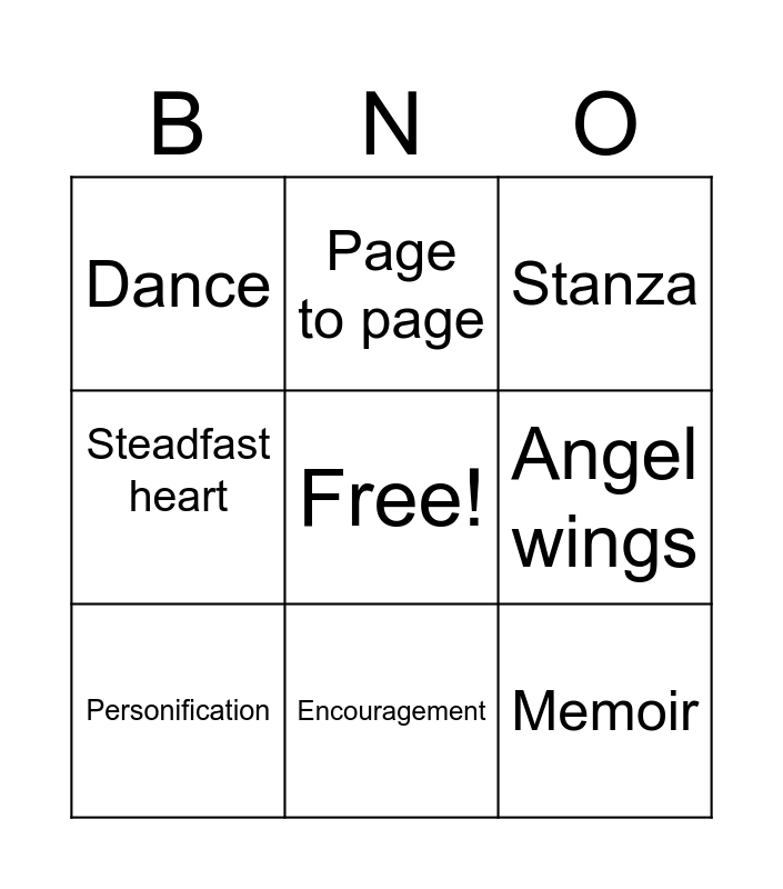 This bingo card has a free space and 22 words: Reader, Tree trunks, Page to page, Support, Angel wings, Personification, Dance, Stanza, Symbolism, Backbone, Metaphor, Steadfast heart, Unfurl, Speak out, Laurie halse Anderson, Mr. Moffa, Shout, Heal, me to you, Memoir, Encouragement and Reminder.