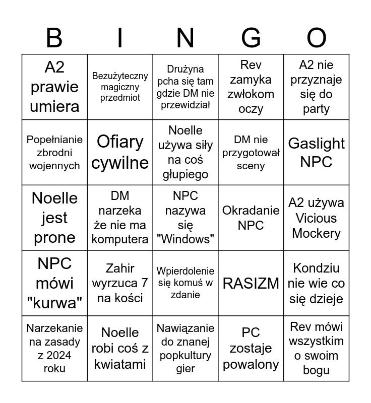 This bingo card has 25 words: Zahir wyrzuca 7 na kości, Nawiązanie do znanej popkultury gier, Noelle używa siły na coś głupiego, Narzekanie na zasady z 2024 roku, A2 nie przyznaje się do party, A2 prawie umiera, Popełnianie zbrodni wojennych, Bezużyteczny magiczny przedmiot, Okradanie NPC, Wpierdolenie się komuś w zdanie, DM nie przygotował sceny, Noelle jest prone, RASIZM, Kondziu nie wie co się dzieje, Ofiary cywilne, Rev mówi wszystkim o swoim bogu, A2 używa Vicious Mockery, Drużyna pcha się tam gdzie DM nie przewidział, Gaslight NPC, DM narzeka że nie ma komputera, NPC nazywa się "Windows", Noelle robi coś z kwiatami, NPC mówi "kurwa", Rev zamyka zwłokom oczy and PC zostaje powalony.