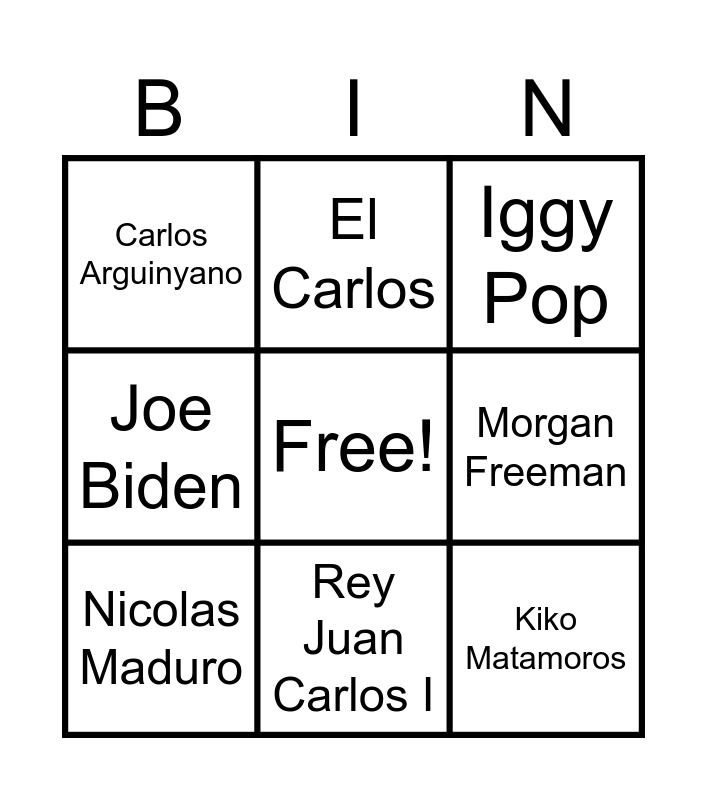 This bingo card has a free space and 8 words: Joe Biden, El Carlos, Morgan Freeman, Nicolas Maduro, Iggy Pop, Carlos Arguinyano, Rey Juan Carlos I and Kiko Matamoros.
