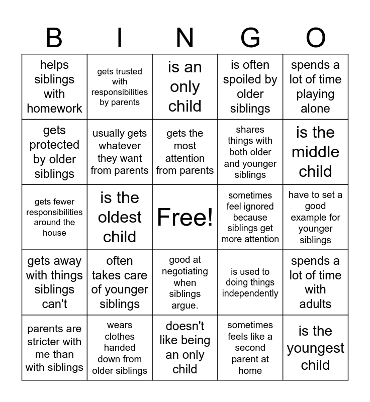 This bingo card has a free space and 24 words: often takes care of younger siblings, wears clothes handed down from older siblings, gets the most attention from parents, parents are stricter with me than with siblings, spends a lot of time playing alone, helps siblings with homework, gets protected by older siblings, gets trusted with responsibilities by parents, sometimes feel ignored because siblings get more attention, good at negotiating when siblings argue., shares things with both older and younger siblings, gets fewer responsibilities around the house, is used to doing things independently, spends a lot of time with adults, usually gets whatever they want from parents, sometimes feels like a second parent at home, have to set a good example for younger siblings, is an only child, is the middle child, is the oldest child, is the youngest child, gets away with things siblings can't, is often spoiled by older siblings and doesn't like being an only child.