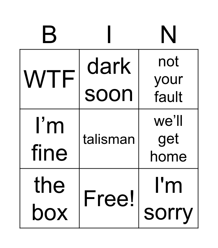 This bingo card has 10 words: Free!, not your fault, WTF, talisman, I’m fine, the box, dark soon, trying to protect you, we’ll get home and I'm sorry.