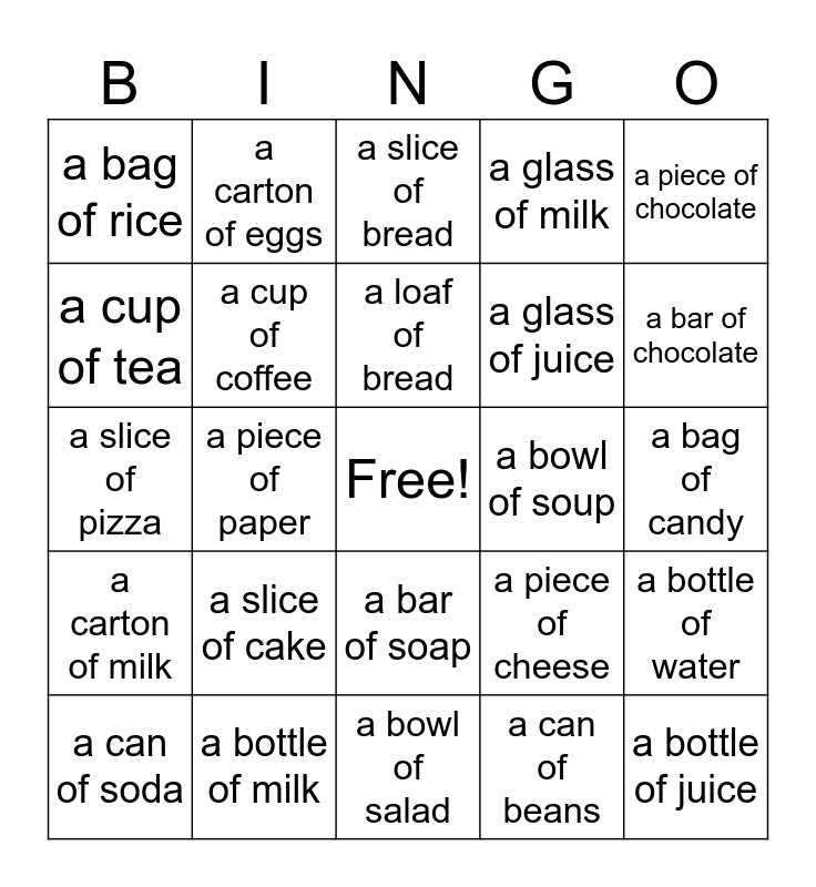 This bingo card has a free space and 24 words: a slice of cake, a bottle of milk, a loaf of bread, a can of soda, a piece of chocolate, a bag of rice, a cup of tea, a carton of eggs, a bowl of soup, a bar of soap, a glass of juice, a slice of pizza, a piece of cheese, a bottle of water, a cup of coffee, a can of beans, a bag of candy, a slice of bread, a bar of chocolate, a piece of paper, a bottle of juice, a carton of milk, a glass of milk and a bowl of salad.