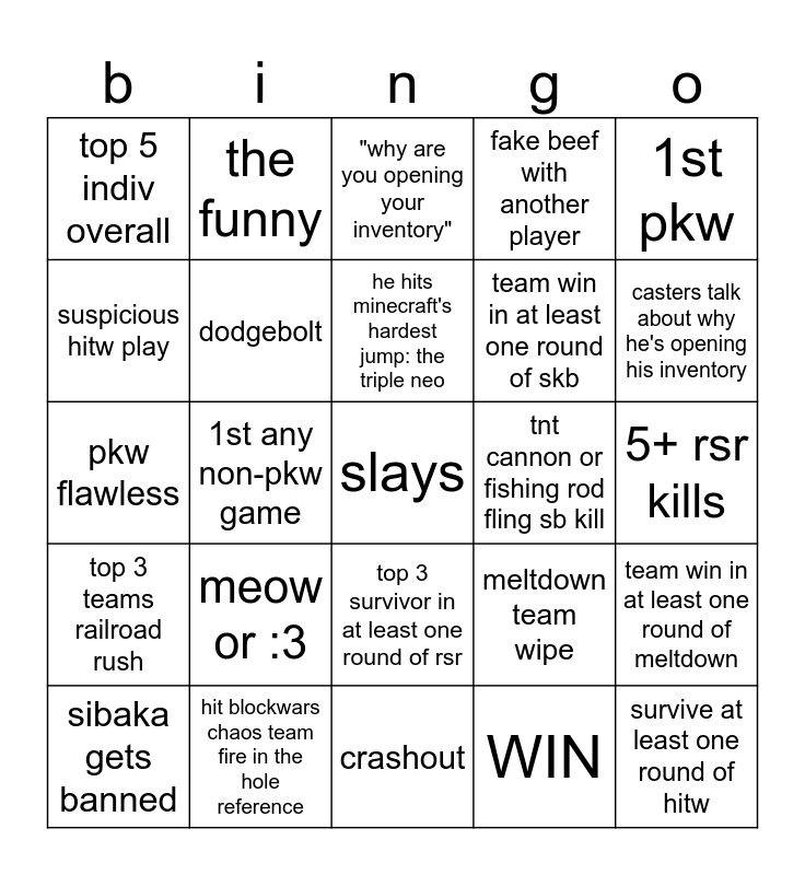 This bingo card has a free space and 24 words: meow or :3, hit blockwars chaos team fire in the hole reference, he hits minecraft's hardest jump: the triple neo, sibaka gets banned, 1st pkw, top 5 indiv overall, suspicious hitw play, the funny, tnt cannon or fishing rod fling sb kill, top 3 survivor in at least one round of rsr, team win in at least one round of skb, pkw flawless, meltdown team wipe, team win in at least one round of meltdown, dodgebolt, WIN, 5+ rsr kills, "why are you opening your inventory", casters talk about why he's opening his inventory, 1st any non-pkw game, survive at least one round of hitw, top 3 teams railroad rush, fake beef with another player and crashout.