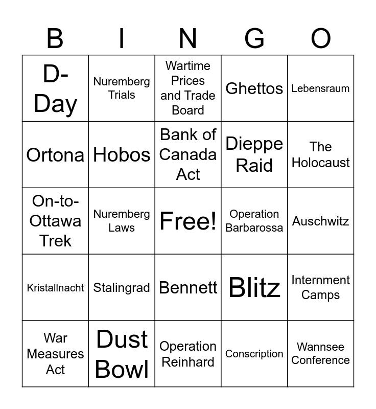 This bingo card has a free space and 40 words: Relief Camps, On-to-Ottawa Trek, Regina Riot, Hobos, Dust Bowl, Bennett, Bank of Canada Act, Fascism, Lebensraum, Kristallnacht, Nuremberg Laws, Ghettos, Wannsee Conference, Auschwitz, Operation Barbarossa, Stalingrad, Blitzkrieg, D-Day, Juno Beach, Wartime Prices and Trade Board, Internment Camps, Conscription, Dieppe Raid, Ortona, Code Talkers, Enigma, Fat Man, Little Boy, Dene People, Eldorado Mine, Uranium-235, War Measures Act, Maginot Line, Blitz, The Holocaust, Operation Reinhard, Judenrat, Vichy France, Nuremberg Trials and Battle of Berlin.