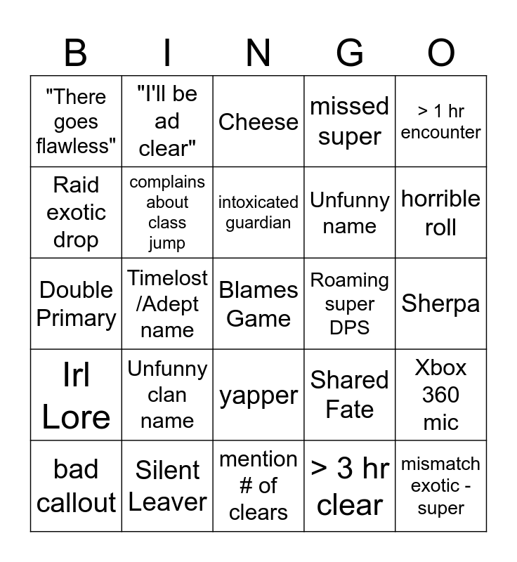 This bingo card has 25 words: Irl Lore, Silent Leaver, Blames Game, > 3 hr clear, > 1 hr encounter, "There goes flawless", "I'll be ad clear", Cheese, Roaming super DPS, Xbox 360 mic, Raid exotic drop, complains about class jump, mention # of clears, Shared Fate, horrible roll, bad callout, Timelost /Adept name, intoxicated guardian, Unfunny name, Sherpa, Double Primary, Unfunny clan name, yapper, missed super and mismatch exotic - super.