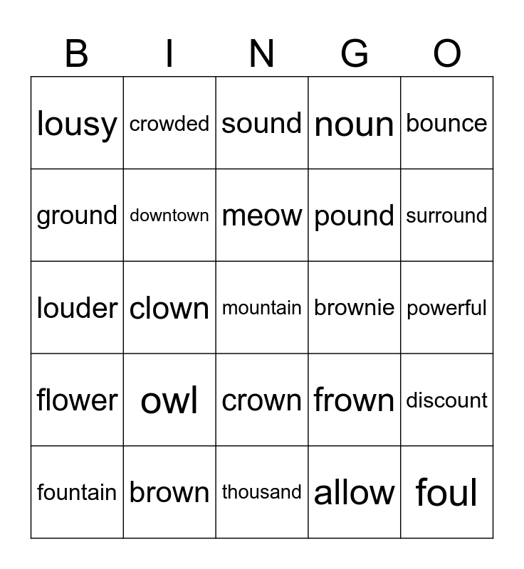 This bingo card has a free space and 24 words: owl, brown, meow, fountain, bounce, lousy, ground, crowded, brownie, crown, pound, louder, frown, discount, downtown, allow, powerful, sound, surround, clown, foul, flower, noun and thousand.