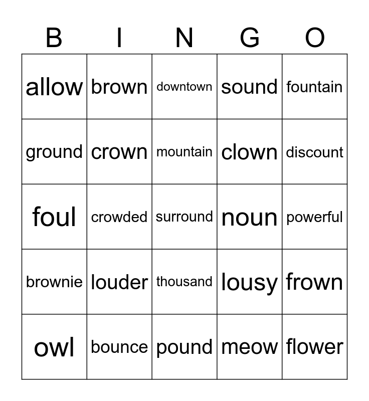 This bingo card has 25 words: brownie, bounce, surround, meow, fountain, allow, brown, downtown, noun, frown, ground, crown, pound, lousy, discount, owl, crowded, mountain, clown, powerful, foul, louder, thousand, sound and flower.