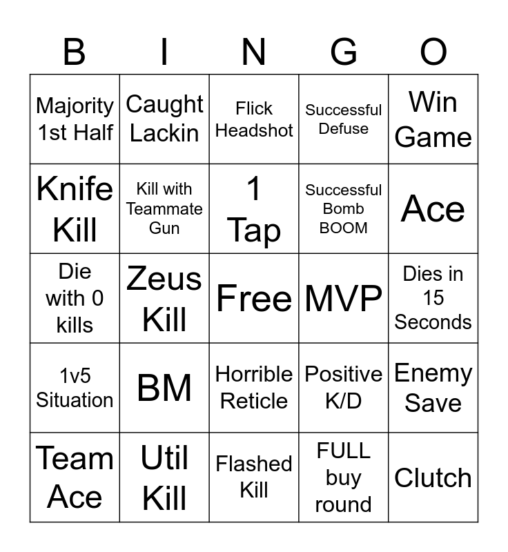 This bingo card has a free space and 24 words: Team Ace, BM, 1 Tap, FULL buy round, Win Game, Majority 1st Half, Caught Lackin, Flick Headshot, MVP, Dies in 15 Seconds, Die with 0 kills, Kill with Teammate Gun, Positive K/D, Enemy Save, Knife Kill, Util Kill, Flashed Kill, Successful Defuse, Ace, 1v5 Situation, Zeus Kill, Horrible Reticle, Successful Bomb BOOM and Clutch.