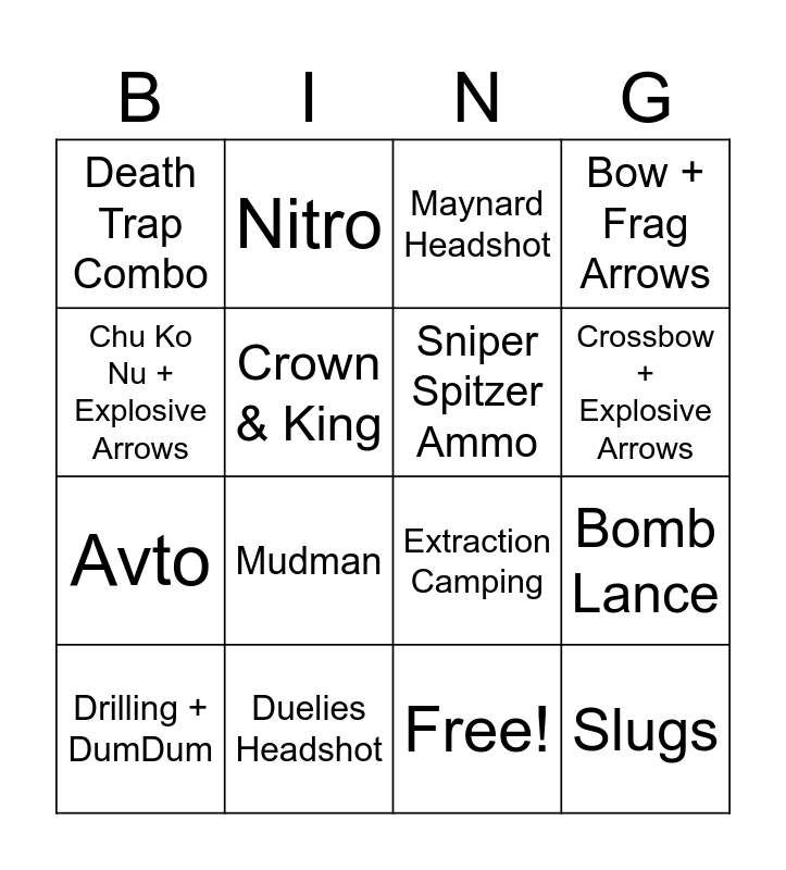 This bingo card has 17 words: Free!, Drilling + DumDum, Maynard Headshot, Death Trap Combo, Mudman, Bow + Frag Arrows, Bomb Lance, Sniper Spitzer Ammo, Crossbow + Explosive Arrows, Crown & King, Duelies Headshot, Extraction Camping, Chu Ko Nu + Explosive Arrows, Nitro, Avto, Headsman and Slugs.