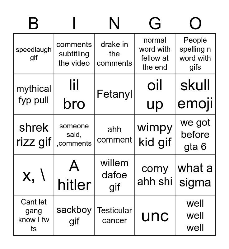 This bingo card has 25 words: A hitler, Testicular cancer, Fetanyl, Cant let gang know I fw ts, People spelling n word with gifs, speedlaugh gif, mythical fyp pull, comments subtitling the video, wimpy kid gif, willem dafoe gif, oil up, shrek rizz gif, corny ahh shi, what a sigma, lil bro, well well well, we got before gta 6, drake in the comments, skull emoji, someone said, ,comments, ahh comment, sackboy gif, x, \, normal word with fellow at the end and unc.