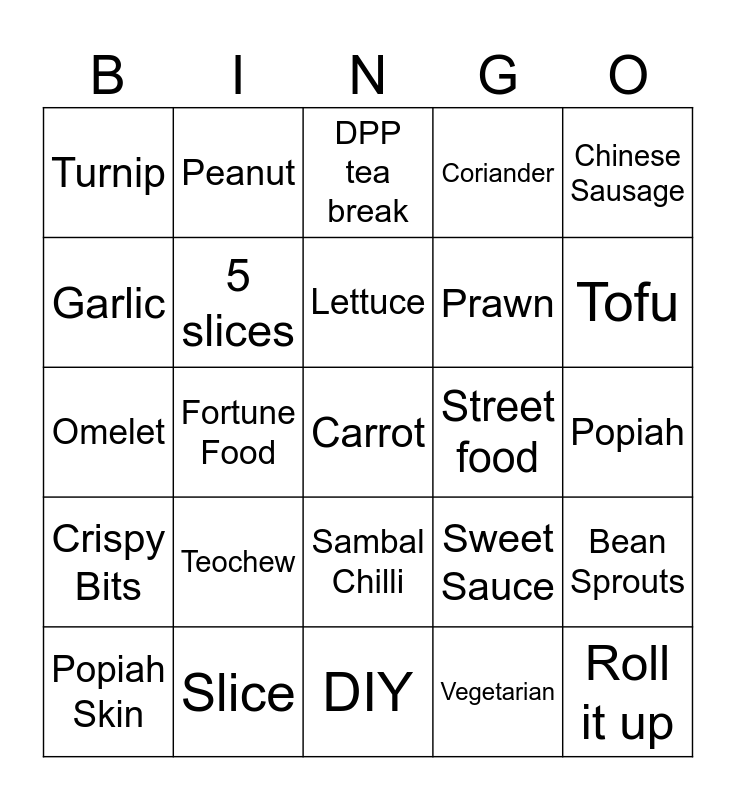 This bingo card has a free space and 26 words: Sambal Chilli, Vegetarian, Lettuce, Slice, Chinese Sausage, Turnip, Garlic, Peanut, Popiah, Sweet Sauce, Prawn, Omelet, Bean Sprouts, Popiah Skin, Fortune Food, Shredded Cucumber, Coriander, Crispy Bits, DPP tea break, Roll it up, Tofu, DIY, Street food, Teochew, 5 slices and Auntie, no chilli.