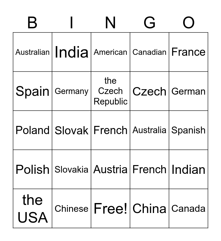 This bingo card has 1 images and 27 words: the USA, the United Kingdom, the Czech Republic, China, France, Spain, India, Austria, Australia, Canada, Poland, Germany, Free!, French, German, Austrian, Slovakia, American, Canadian, Indian, Australian, Chinese, French, Czech, Spanish, Polish and Slovak.