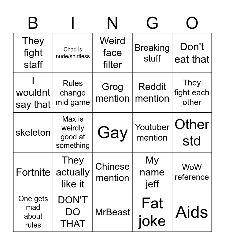 This bingo card has a free space and 44 words: They overspend, Aids, Extremely drunk, One gets mad about rules, Australian thing, Fat joke, Weird face filter, They do a repeat bit, Don't eat that, DON'T DO THAT, Breaking stuff, Youtuber mention, Chinese mention, They actually like it, Straight up lying, MrBeast, vine meme, skeleton, Patreon only, They fight each other, Chad is nude/shirtless, Retro, Miss the point, They fight staff, E would save her, Other std, Little character, Joji, My name jeff, Fortnite, Idubbbz, WoW reference, Spoonful, Chad is weirdly good at something, Max is weirdly good at something, King Bach, Markiplier, They get tricked, Grog mention, I wouldnt say that, Reddit mention, Darcy intervenes, Rules change mid game and They get scammed.