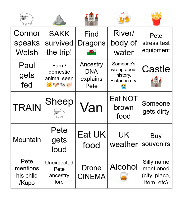 This bingo card has a free space and 24 words: Pete gets loud, Unexpected Pete ancestry lore, Ancestry DNA explains Pete, Pete mentions his child /Kupo, Pete stress test equipment, Connor speaks Welsh, Paul gets fed, SAKK survived the trip!, Eat NOT brown food, Eat UK food, Someone's wrong about history. Historian cry.π, TRAIN, UK weather, Buy souvenirs, Farm/ domestic animal seen π±πΆππ, Alcohol π₯, Someone gets dirty, Find Dragons π΄σ §σ ’σ ·σ ¬σ ³σ Ώ, Castle π°, Sheep π, Silly name mentioned (city, place, item, etc), Mountain, River/ body of water and Drone CINEMA.