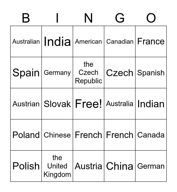 This bingo card has 1 images, a free space and 26 words: the USA, the United Kingdom, the Czech Republic, China, France, Spain, India, Austria, Australia, Canada, Poland, Germany, French, German, Austrian, Slovakia, American, Canadian, Indian, Australian, Chinese, French, Czech, Spanish, Polish and Slovak.