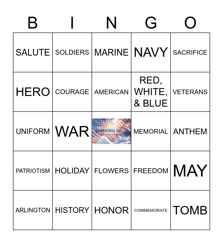 This bingo card has a free space and 34 words: REMEMBRANCE, COMMEMORATE, DECORATION, OBSERVANCE, PATRIOTISM, COURAGE, SACRIFICE, ARLINGTON, SOLDIERS, CEREMONY, AMERICAN, MARINE, AIR FORCE, COAST GUARD, MEMORIAL, VETERANS, HISTORY, UNIFORM, HOLIDAY, FREEDOM, FLOWERS, PARADE, SALUTE, ANTHEM, HONOR, TOMB, NAVY, ARMY, RED, WHITE, & BLUE, HERO, FLAG, WAR, MAY and BRAVERY.