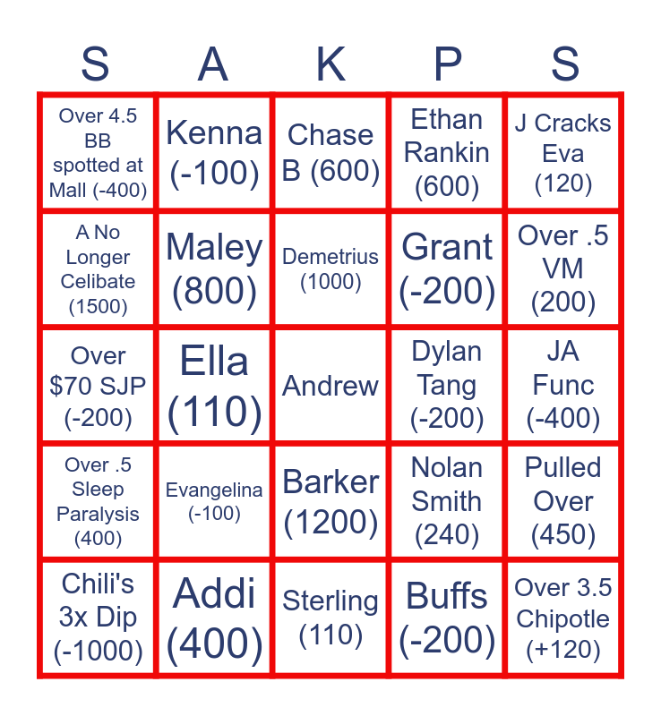This bingo card has a free space and 24 words: Chili's 3x Dip (-1000), Evangelina (-100), Demetrius (1000), Buffs (-200), J Cracks Eva (120), Over 4.5 BB spotted at Mall (-400), Kenna (-100), Chase B (600), Dylan Tang (-200), JA Func (-400), Over $70 SJP (-200), Maley (800), Nolan Smith (240), Pulled Over (450), A No Longer Celibate (1500), Addi (400), Sterling (110), Ethan Rankin (600), Over .5 VM (200), Over .5 Sleep Paralysis (400), Ella (110), Barker (1200), Grant (-200) and Over 3.5 Chipotle (+120).