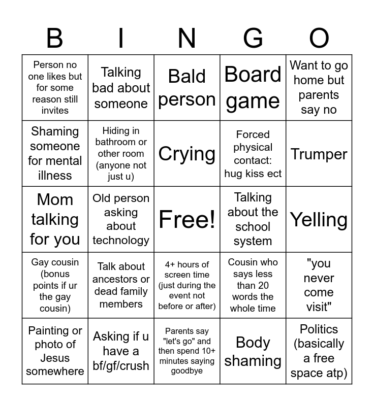 This bingo card has a free space and 24 words: Talk about ancestors or dead family members, Asking if u have a bf/gf/crush, Crying, Painting or photo of Jesus somewhere, Want to go home but parents say no, Person no one likes but for some reason still invites, Shaming someone for mental illness, Talking bad about someone, Talking about the school system, 4+ hours of screen time (just during the event not before or after), Forced physical contact: hug kiss ect, Mom talking for you, Cousin who says less than 20 words the whole time, "you never come visit", Hiding in bathroom or other room (anyone not just u), Body shaming, Yelling, Bald person, Trumper, Old person asking about technology, Politics (basically a free space atp), Gay cousin (bonus points if ur the gay cousin), Board game and Parents say "let's go" and then spend 10+ minutes saying goodbye.