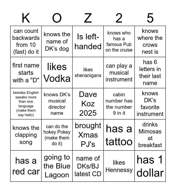 This bingo card has a free space and 24 words: can do the hokey Pokey (make them do it), going to the Blue Lagoon, likes shenanigans, has a red car, knows where the crows nest is, can count backwards from 10 (fast) do it, first name starts with a "D", knows the name of DK’s dog, cabin number has the number 9 in it, brought Xmas PJ's, can play a musical instrument, besides English speaks more than one language (make them say hello), has a tattoo, drinks Mimosas at breakfast, likes Vodka, likes Hennessy, knows DK’s favorite instrument, Is left-handed, has 6 letters in their last name, knows DK’s musical director name, has 1 dollar, knows the clapping song, knows who has a famous Pub on the cruise and name of DKs/BJ latest CD.