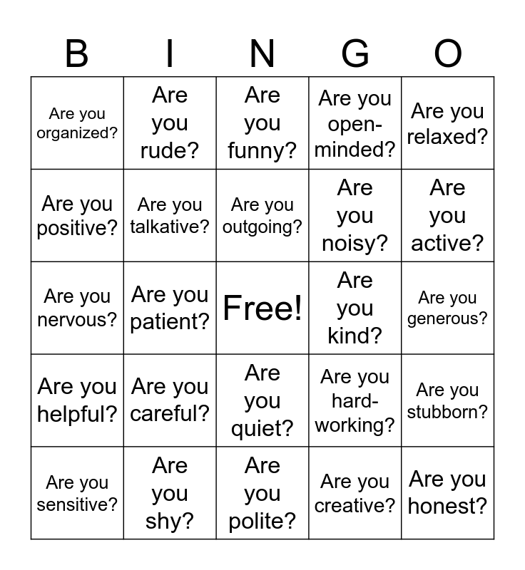 This bingo card has a free space and 30 words: Are you shy?, Are you friendly?, Are you patient?, Are you serious?, Are you organized?, Are you funny?, Are you talkative?, Are you quiet?, Are you kind?, Are you polite?, Are you generous?, Are you honest?, Are you creative?, Are you lazy?, Are you active?, Are you smart?, Are you hard-working?, Are you helpful?, Are you careful?, Are you relaxed?, Are you nervous?, Are you calm?, Are you rude?, Are you noisy?, Are you positive?, Are you open-minded?, Are you stubborn?, Are you sensitive?, Are you outgoing? and Are you emotional?.