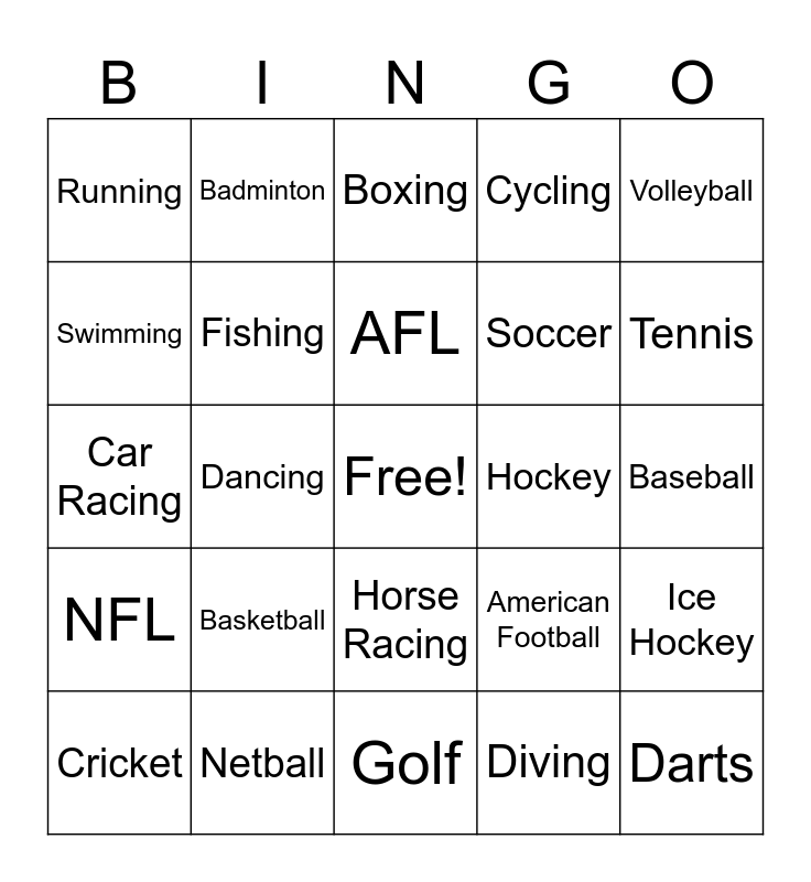 This bingo card has a free space and 24 words: Basketball, Netball, AFL, Cricket, Volleyball, Running, Swimming, Badminton, Hockey, Horse Racing, Soccer, Car Racing, American Football, Ice Hockey, Fishing, Diving, Baseball, Boxing, Tennis, Dancing, Darts, NFL, Cycling and Golf.
