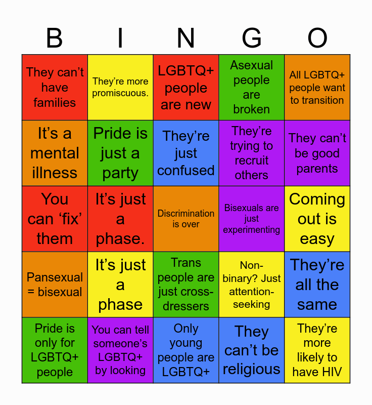 This bingo card has a free space and 24 words: It’s just a phase, You can tell someone’s LGBTQ+ by looking, They’re just confused, Pride is only for LGBTQ+ people, All LGBTQ+ people want to transition, They can’t have families, It’s a mental illness, They’re more promiscuous., Bisexuals are just experimenting, Trans people are just cross-dressers, They’re trying to recruit others, You can ‘fix’ them, Non-binary? Just attention-seeking, They’re all the same, Pride is just a party, They can’t be religious, Coming out is easy, LGBTQ+ people are new, They can’t be good parents, It’s just a phase., They’re more likely to have HIV, Pansexual = bisexual, Asexual people are broken and Only young people are LGBTQ+.