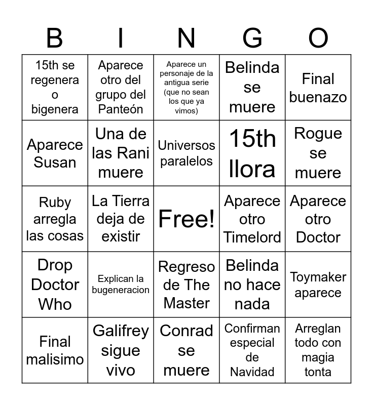 This bingo card has a free space and 24 words: Explican la bugeneracion, Galifrey sigue vivo, Universos paralelos, Final malisimo, Final buenazo, 15th se regenera o bigenera, Aparece Susan, Aparece otro del grupo del Panteón, Aparece otro Timelord, Regreso de The Master, 15th llora, Ruby arregla las cosas, Belinda no hace nada, Toymaker aparece, Una de las Rani muere, Confirman especial de Navidad, Aparece otro Doctor, Aparece un personaje de la antigua serie (que no sean los que ya vimos), Rogue se muere, La Tierra deja de existir, Arreglan todo con magia tonta, Drop Doctor Who, Belinda se muere and Conrad se muere.