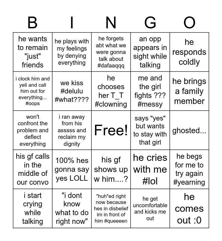 This bingo card has a free space and 24 words: 100% hes gonna say yes LOLL, "i dont know what to do right now", he chooses her T_T #clowning, i start crying while talking, he responds coldly, he wants to remain "just" friends, i clock him and yell and call him out for everything... #oops, he plays with my feelings by denying everything, says "yes" but wants to stay with that girl, his gf shows up w him....?, me and the girl fights ??? #messy, won't confront the problem and deflect everything, he cries with me #lol, he begs for me to try again #yearning, we kiss #delulu #what????, he get uncomfortable and kicks me out, ghosted..., he forgets abt what we were gonna talk about #dafaaqqq, he brings a family member, i ran away from his asssss and reclaim my dignity, he comes out :0, his gf calls in the middle of our convo, an opp appears in sight while talking and "huh"ed right now because hes in disbelief im in front of him #queeeen.
