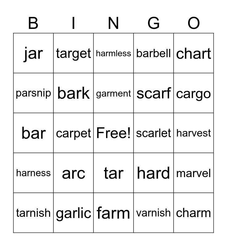 This bingo card has a free space and 24 words: tarnish, arc, garment, varnish, chart, jar, target, harmless, scarlet, harvest, bar, bark, hard, marvel, parsnip, garlic, farm, barbell, cargo, harness, carpet, tar, scarf and charm.