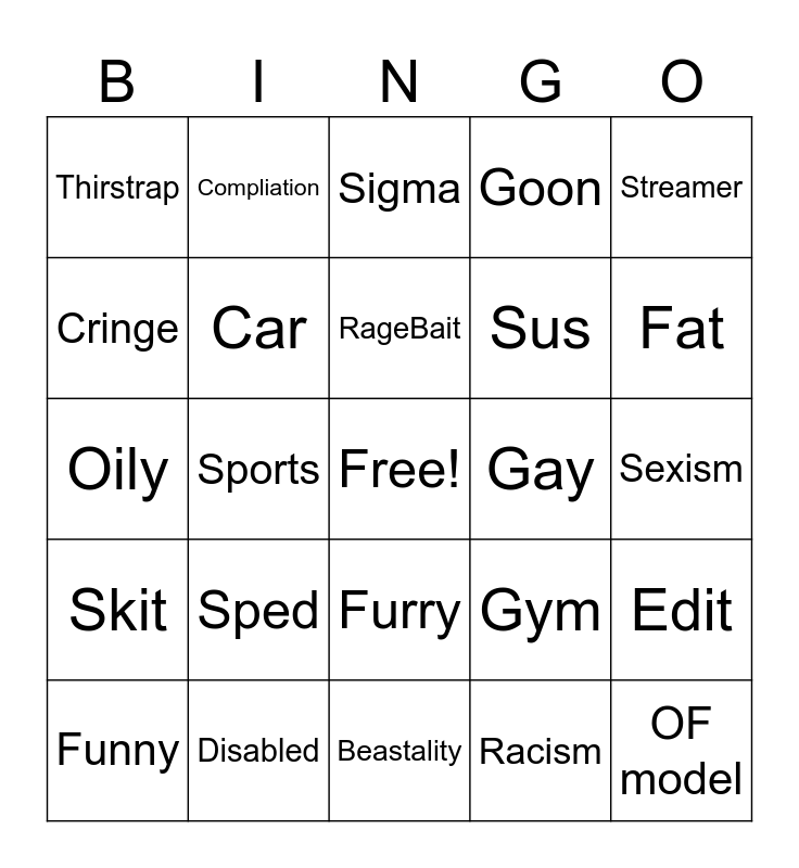 This bingo card has a free space and 24 words: Sped, Disabled, RageBait, Funny, Streamer, Thirstrap, Cringe, Compliation, Gay, Furry, Sus, Oily, Gym, Edit, Car, Racism, Sexism, Sigma, Fat, Sports, OF model, Skit, Goon and Beastality.
