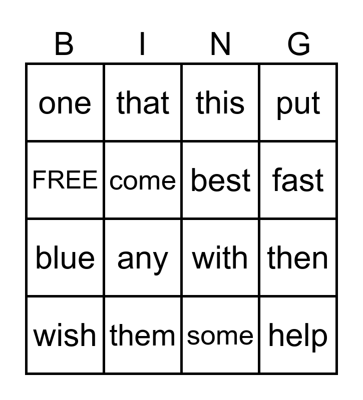 This bingo card has 16 words: them, then, this, one, blue, that, with, some, FREE, come, wish, put, any, fast, best and help.