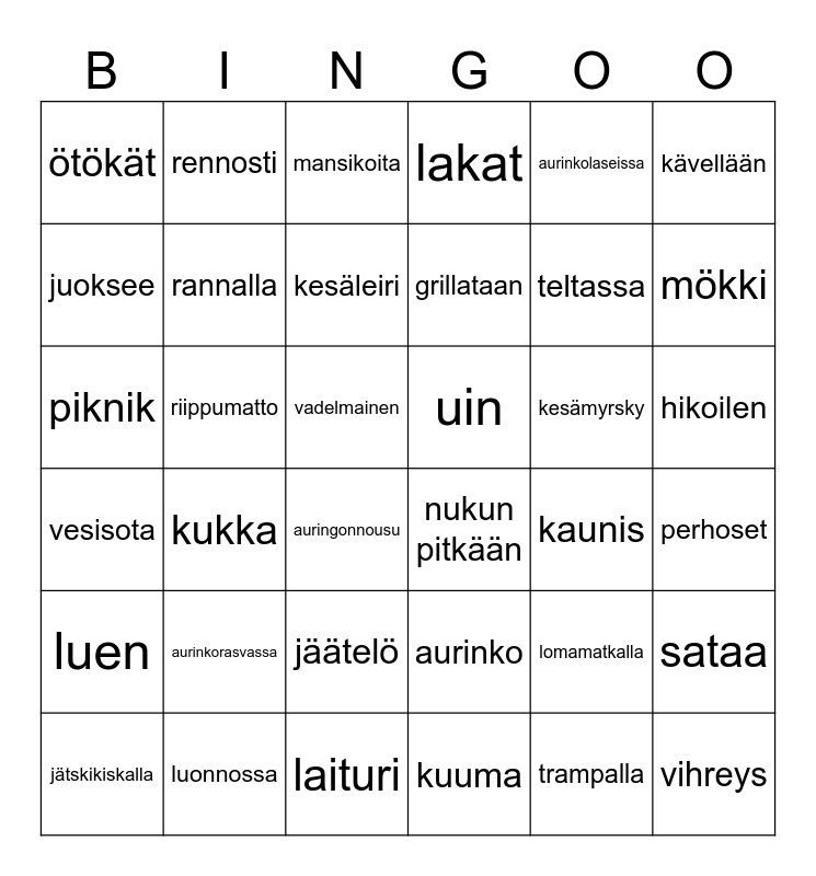 This bingo card has 36 words: aurinko, jäätelö, kuuma, juoksee, vesisota, uin, rannalla, laituri, aurinkolaseissa, lomamatkalla, mökki, lakat, sataa, riippumatto, grillataan, ötökät, luen, kesämyrsky, piknik, mansikoita, vadelmainen, kukka, nukun pitkään, auringonnousu, kaunis, rennosti, teltassa, luonnossa, kesäleiri, kävellään, vihreys, jätskikiskalla, perhoset, hikoilen, aurinkorasvassa and trampalla.