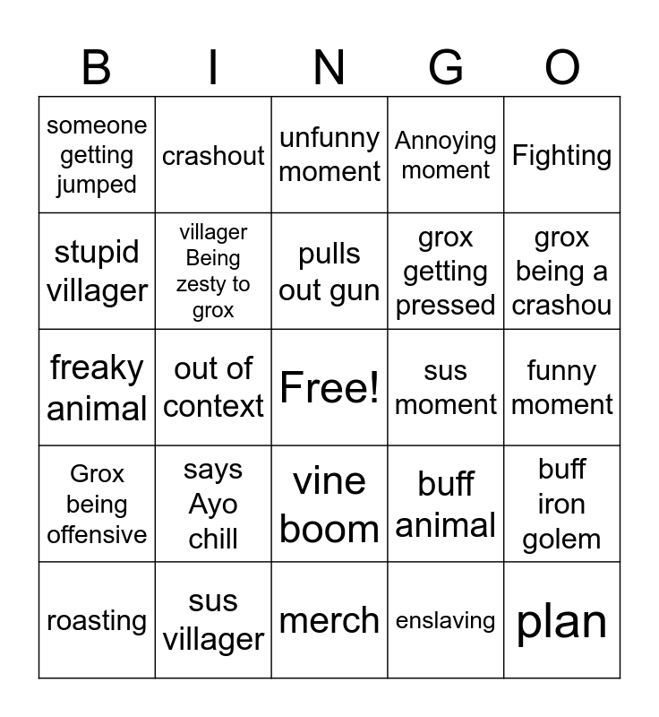 This bingo card has a free space and 24 words: says Ayo chill, sus villager, pulls out gun, roasting, Fighting, someone getting jumped, stupid villager, crashout, sus moment, vine boom, grox getting pressed, freaky animal, buff animal, buff iron golem, villager Being zesty to grox, enslaving, funny moment, unfunny moment, grox being a crashou, out of context, plan, Grox being offensive, Annoying moment and merch.