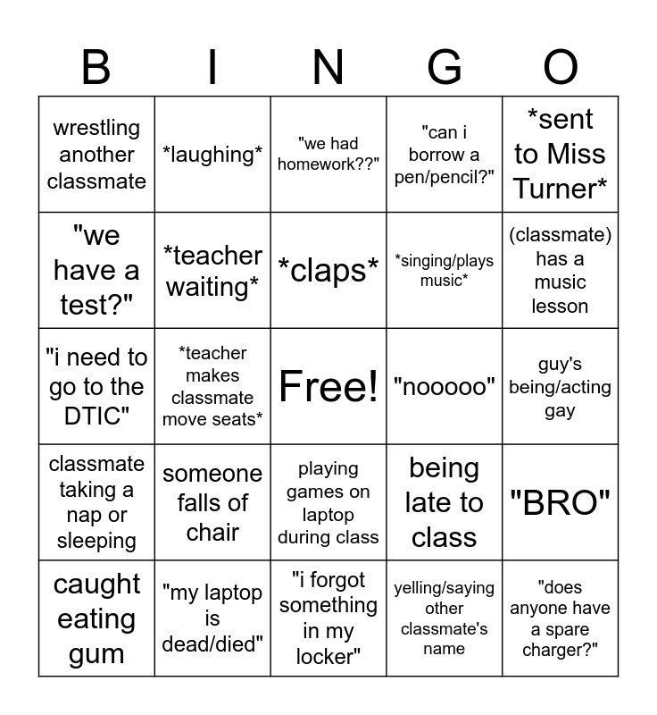 This bingo card has a free space and 24 words: someone falls of chair, "my laptop is dead/died", *claps*, caught eating gum, *sent to Miss Turner*, wrestling another classmate, "we have a test?", *laughing*, "nooooo", playing games on laptop during class, *singing/plays music*, "i need to go to the DTIC", being late to class, "BRO", *teacher waiting*, yelling/saying other classmate's name, guy's being/acting gay, "we had homework??", (classmate) has a music lesson, *teacher makes classmate move seats*, "does anyone have a spare charger?", classmate taking a nap or sleeping, "can i borrow a pen/pencil?" and "i forgot something in my locker".