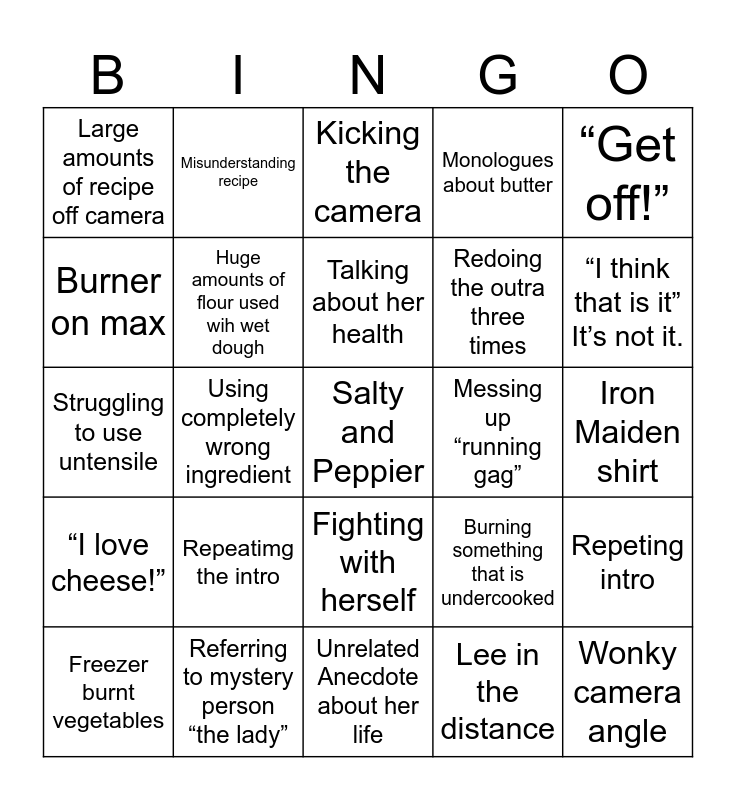This bingo card has a free space and 24 words: Repeatimg the intro, Referring to mystery person “the lady”, Talking about her health, Freezer burnt vegetables, “Get off!”, Large amounts of recipe off camera, Burner on max, Misunderstanding recipe, Messing up “running gag”, Fighting with herself, Redoing the outra three times, Struggling to use untensile, Burning something that is undercooked, Repeting intro, Huge amounts of flour used wih wet dough, Lee in the distance, Iron Maiden shirt, Kicking the camera, “I think that is it” It’s not it., Using completely wrong ingredient, Wonky camera angle, “I love cheese!”, Monologues about butter and Unrelated Anecdote about her life.