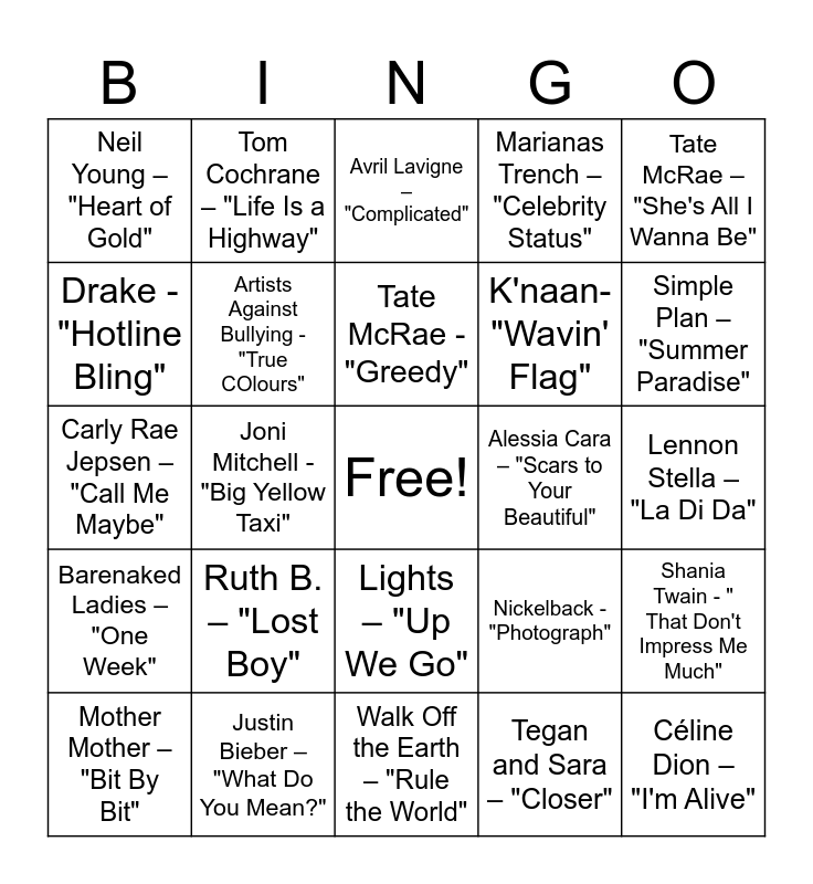 This bingo card has a free space and 44 words: Shawn Mendes – "There's Nothing Holdin' Me Back", Céline Dion – "I'm Alive", Arkells – "Leather Jacket", Mother Mother – "Bit By Bit", Johnny Orlando – "Everybody Wants You", Tegan and Sara – "Closer", Avril Lavigne – "Complicated", Bryan Adams – "Summer of '69", Tate McRae – "She's All I Wanna Be", Justin Bieber – "What Do You Mean?", Marianas Trench – "Celebrity Status", Alessia Cara – "Scars to Your Beautiful", Lights – "Up We Go", Ruth B. – "Lost Boy", The Weeknd – "Blinding Lights, Walk Off the Earth – "Rule the World", Nelly Furtado – "I'm Like a Bird", Carly Rae Jepsen – "Call Me Maybe", The Tragically Hip – "Ahead by a Century", Simple Plan – "Summer Paradise", Tom Cochrane – "Life Is a Highway", Kardinal Offishall ft. Akon – "Dangerous", Classified – "Inner Ninja", Neil Young – "Heart of Gold", Corey Hart – "Sunglasses at Night", Lennon Stella – "La Di Da", Great Big Sea – "Ordinary Day", Avril Lavigne – "Sk8er Boi", Nickelback - "Photograph", Barenaked Ladies – "One Week", Stompin' Tom Connors - "The Hockey Song", Shania Twain - " That Don't Impress Me Much", Barenaked Ladies – " If I had $1,000,000", Chilliwack - "My girl (gone, gone, gone)", Joni Mitchell - "Big Yellow Taxi", Hedley - "For the Nights I Can't Remember", Justin Bieber - "Boyfriend", Hedley - "Cha-Ching", Tate McRae - "Greedy", Drake - "Hotline Bling", K'naan- "Wavin' Flag", Nelly Furtado - "Promiscuous", Artists Against Bullying - "True COlours" and Nikki Yanofsky - "I believe".