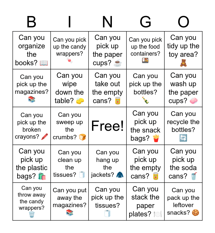 This bingo card has a free space and 27 words: Can you pick up the empty cans? ๐ฅซ, Can you pick up the newspapers? ๐ฐ, Can you pick up the bottles? ๐พ, Can you pick up the tissues? ๐งป, Can you pick up the magazines? ๐, Can you pick up the paper cups? โ, Can you pick up the candy wrappers? ๐ฌ, Can you pick up the plastic bags? ๐๏ธ, Can you pick up the snack bags? ๐, Can you pick up the soda cans? ๐ฅค, Can you pick up the broken crayons? ๐๏ธ, Can you pick up the food containers? ๐ฑ, Can you throw away the candy wrappers? ๐๏ธ, Can you put away the magazines? ๐, Can you wash up the paper cups? ๐งผ, Can you fold up the newspapers? ๐ฐ, Can you wipe down the table? ๐งฝ, Can you take out the empty cans? ๐ฅซ, Can you clean up the tissues? ๐งป, Can you organize the books? ๐, Can you recycle the bottles? ๐, Can you stack the paper plates? ๐ฝ๏ธ, Can you sweep up the crumbs? ๐, Can you pack up the leftover snacks? ๐ช, Can you hang up the jackets? ๐งฅ, Can you tidy up the toy area? ๐งธ and Can you clear off the counter? ๐ฝ๏ธ.