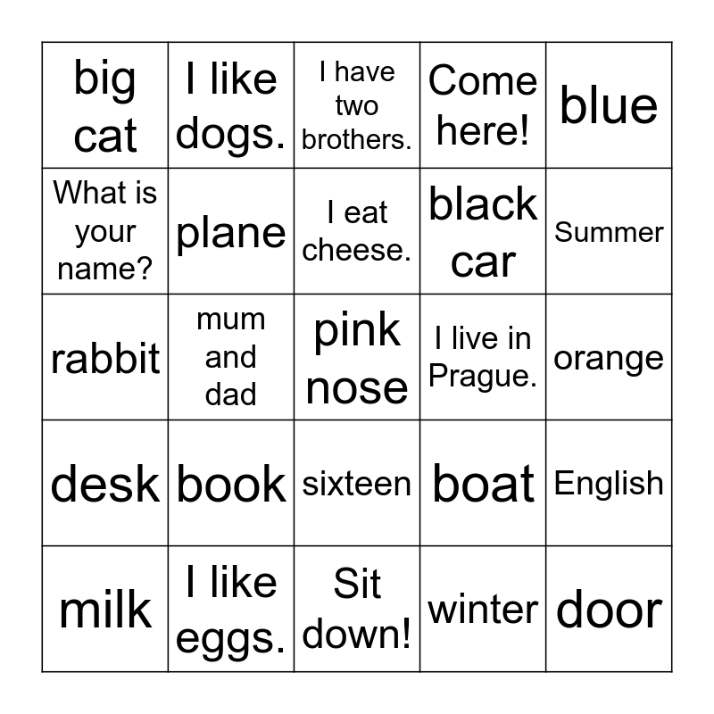 This bingo card has a free space and 24 words: book, I like eggs., I eat cheese., milk, blue, big cat, What is your name?, I like dogs., I live in Prague., sixteen, black car, rabbit, boat, English, plane, winter, orange, I have two brothers., Summer, mum and dad, door, desk, Come here! and Sit down!.
