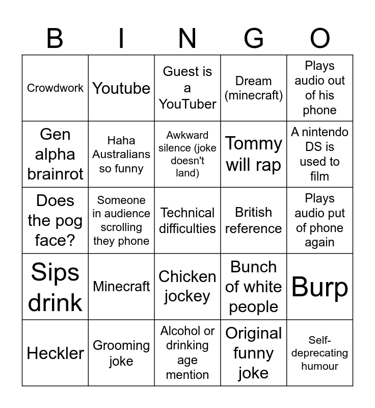 This bingo card has a free space and 24 words: Minecraft, Grooming joke, Awkward silence (joke doesn't land), Heckler, Plays audio out of his phone, Crowdwork, Gen alpha brainrot, Youtube, British reference, Chicken jockey, Tommy will rap, Does the pog face?, Bunch of white people, Burp, Haha Australians so funny, Original funny joke, Plays audio put of phone again, Guest is a YouTuber, A nintendo DS is used to film, Someone in audience scrolling they phone, Self-deprecating humour, Sips drink, Dream (minecraft) and Alcohol or drinking age mention.