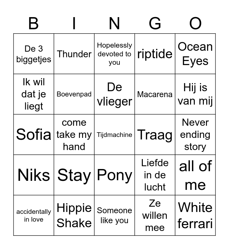 This bingo card has 30 words: Hippie Shake, Rodeo, come take my hand, easy on me, De 3 biggetjes, Hopelessly devoted to you, Boevenpad, Pony, Traag, Someone like you, Never ending story, Tijdmachine, Ze willen mee, White ferrari, Hij is van mij, Bad ad love, Liefde in de lucht, Niks, Stay, Ocean Eyes, Sofia, uptown funk, Thunder, Macarena, Ik wil dat je liegt, riptide, all of me, accidentally in love, De vlieger and YMCA.