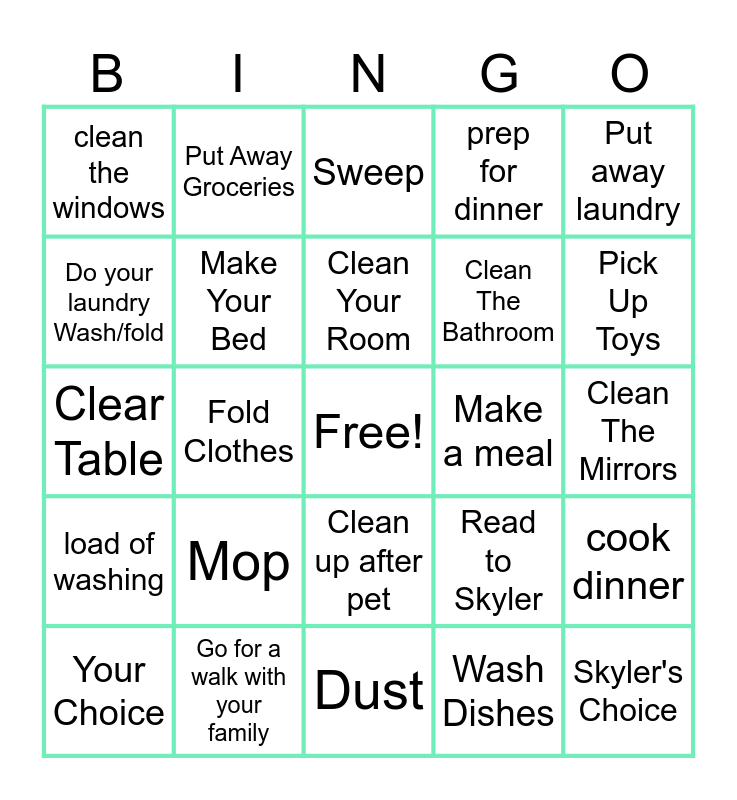 This bingo card has a free space and 24 words: Mop, Go for a walk with your family, Clean Your Room, Your Choice, Put away laundry, clean the windows, Do your laundry Wash/fold, Put Away Groceries, Make a meal, Clean up after pet, Clean The Bathroom, Clear Table, Read to Skyler, cook dinner, Make Your Bed, Wash Dishes, Clean The Mirrors, Sweep, Pick Up Toys, Fold Clothes, Skyler's Choice, load of washing, prep for dinner and Dust.