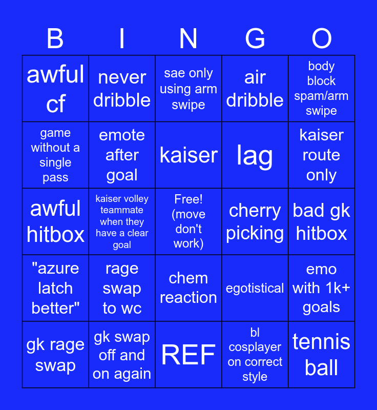 This bingo card has a free space and 24 words: rage swap to wc, gk swap off and on again, kaiser, gk rage swap, body block spam/arm swipe, awful cf, game without a single pass, never dribble, cherry picking, chem reaction, lag, awful hitbox, egotistical, emo with 1k+ goals, emote after goal, bl cosplayer on correct style, bad gk hitbox, sae only using arm swipe, kaiser route only, kaiser volley teammate when they have a clear goal, tennis ball, "azure latch better", air dribble and REF.