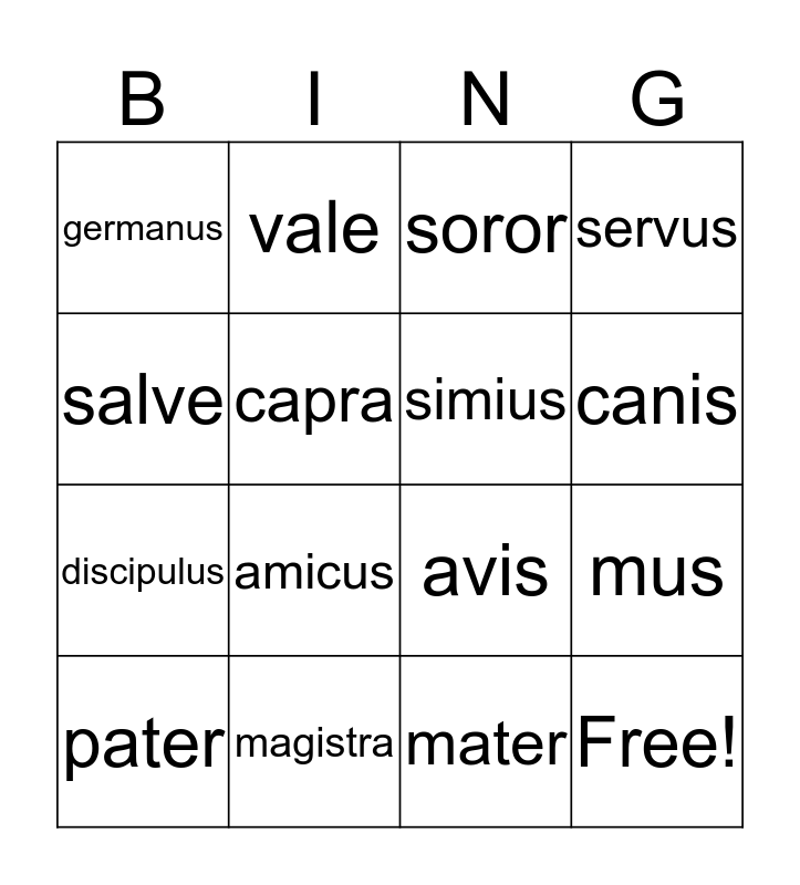 This bingo card has a free space and 17 words: mater, pater, soror, germanus, amicus, servus, mus, simius, canis, capra, magistra, Free!, salve, vale, discipulus, discipula and nomen.
